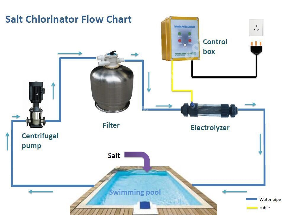 Sodyum klorür çözeltisinin elektrolizi ile sodyum hipoklorit doğrudan kullanım yerinde elde edilir. Çözeltinin konsantrasyonu 2-9 gr/l Cl2 olmalıdır. Aynı işlem deniz suyu kullanan havuzlarda veya havuz suyunun tuzlandırılması ile dolaşımdaki suyun bir kısmının elektroliz hücresinden geçirilmesi şeklinde de uygulanır. Elektroliz sonucu ortaya çıkan hidrojen ortamdan uzaklaştırılmalıdır. Sodyum hipoklorit eriyiğinin filtre edilmiş suya verilmesi dozaj pompası ile olur su sert olursa NaOCl aşılama enjektörünü tıkayabilir. Ayrıca havuz suyunun pH değerini sürekli olarak yükseltir. pH değerinin ayarı için yeterli aside ihtiyaç vardır.