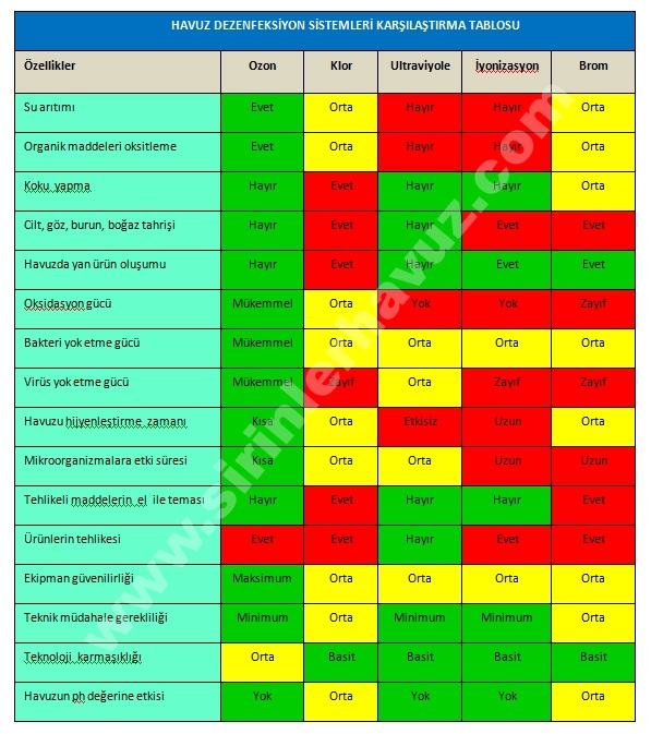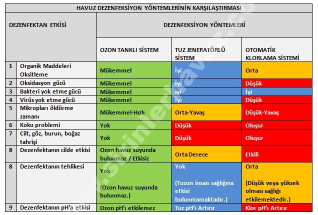 Havuz Dezenfeksiyon ; Yüzme havuz içindeki mikrobik kirliliklere sürekli pislendiğinden, temiz suda ve havuz suyunda, hazırlama aşamasında desteklenen etkili bir dezenfeksiyon zorunludur. Etkili dezenfeksiyon 104 adet Pseudomonas aeruginosa’nın 30 s içinde yok edileceği etki esas alınmıştır. Havuz suyunda dezenfeksiyon maddelerinin etkisi diğer kimyasal etkisi ile bozulmamalıdır. Havuz suyunun dezenfeksiyonunda kullanılabilecek malzeme ve metodlar TS 266 veya aynı grup bir standarta başkaca malzemenin kullanımı kesin olarak yasaktır.